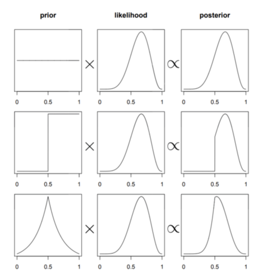 从上面的图我们可以看出,中间这一列都是相同的likelihood,但由于先验(左列)不同,后验(右列)也会发生变化。因此,如何选择一个合理的先验是非常重要的,后面课程我们将详细介绍先验如何选择。