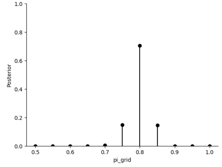 # 使用 plt.stem() 绘制垂直柱状图,表示在 pi_grid 上的 posterior 分布